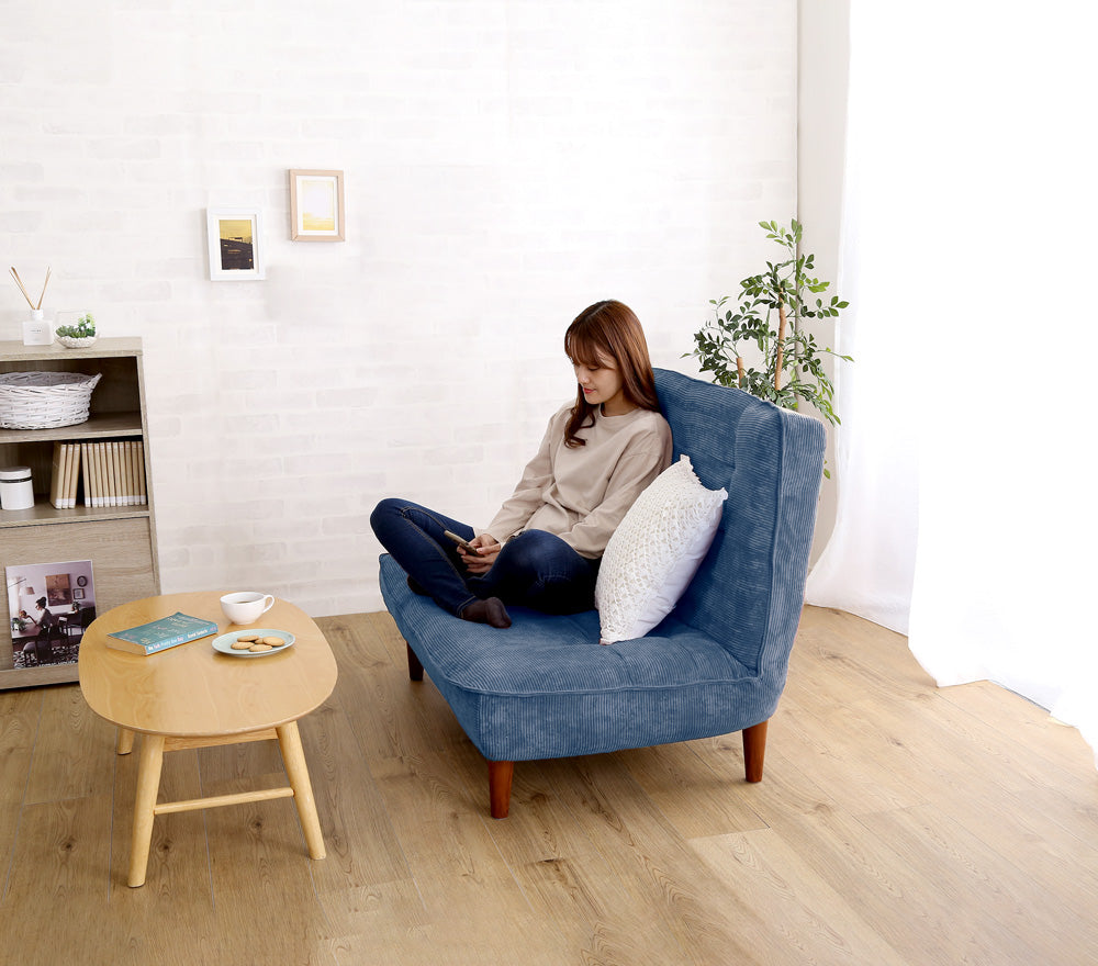 ハイバックの2人掛けリクライニングコーデュロイソファ。