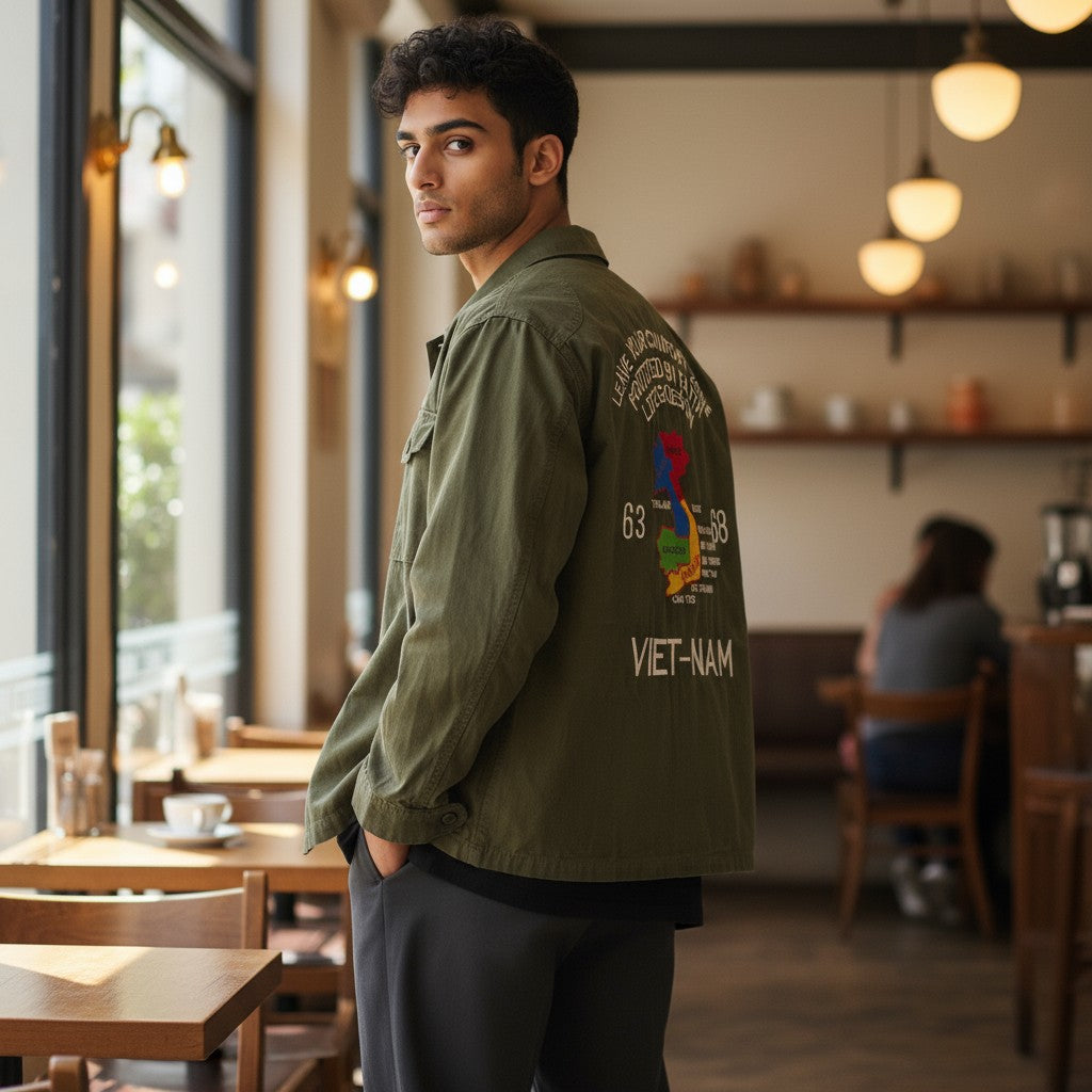 ミリタリー ベトナム シャツ ジャケット カーキ S 古着 メンズ 古着男子 アメカジ古着 ベトジャン 刺繍 緑 グリーン