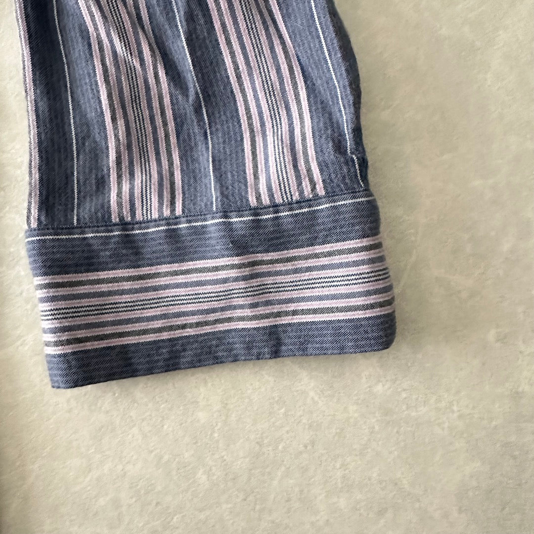 【LAD MUSICIAN】マルチ ストライプ ステンカラー シャツ コート ストライプ柄 44 古着 メンズ 古着男子 ブランド古着 ストリート古着 グレー ピンク ゆるだぼ ゆったり モード