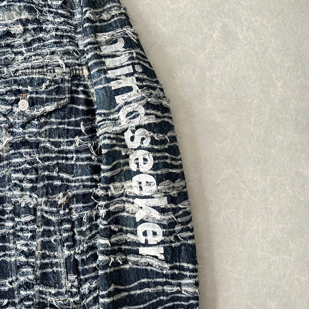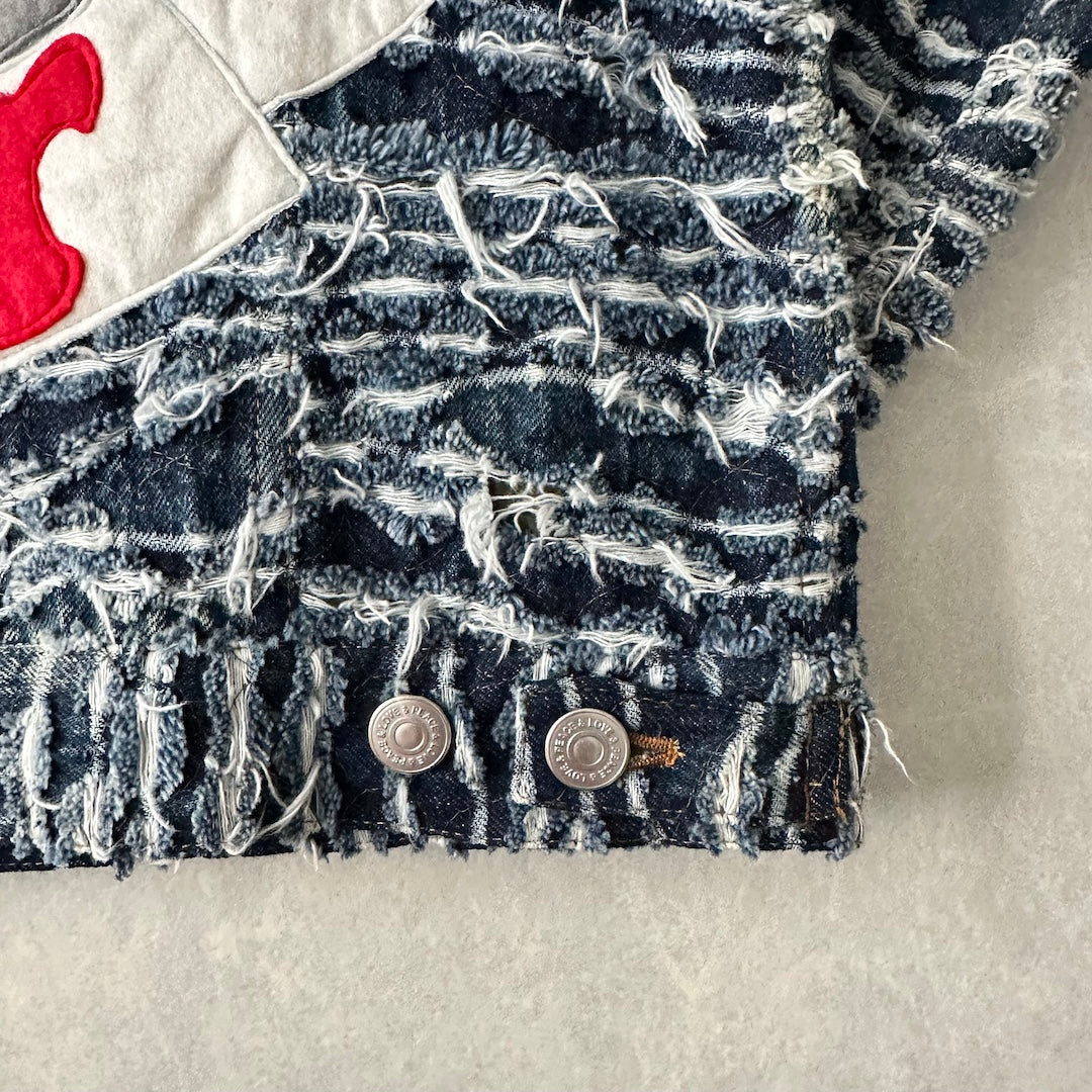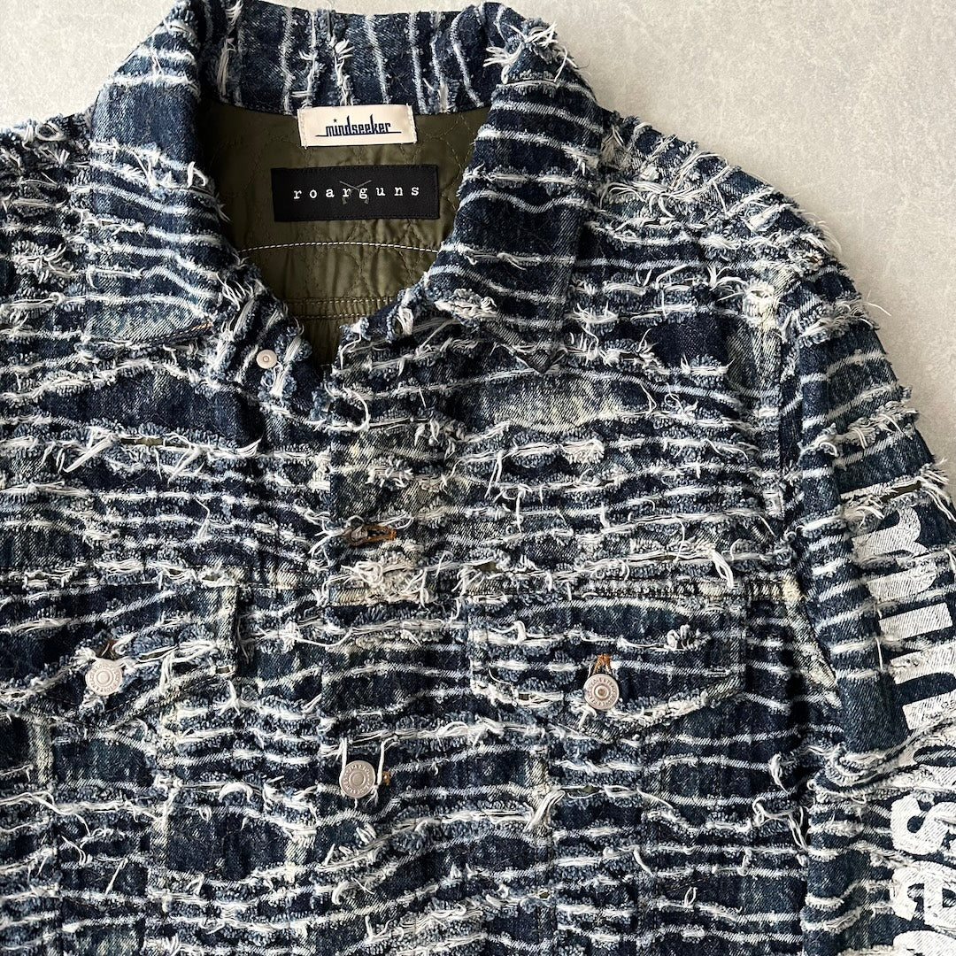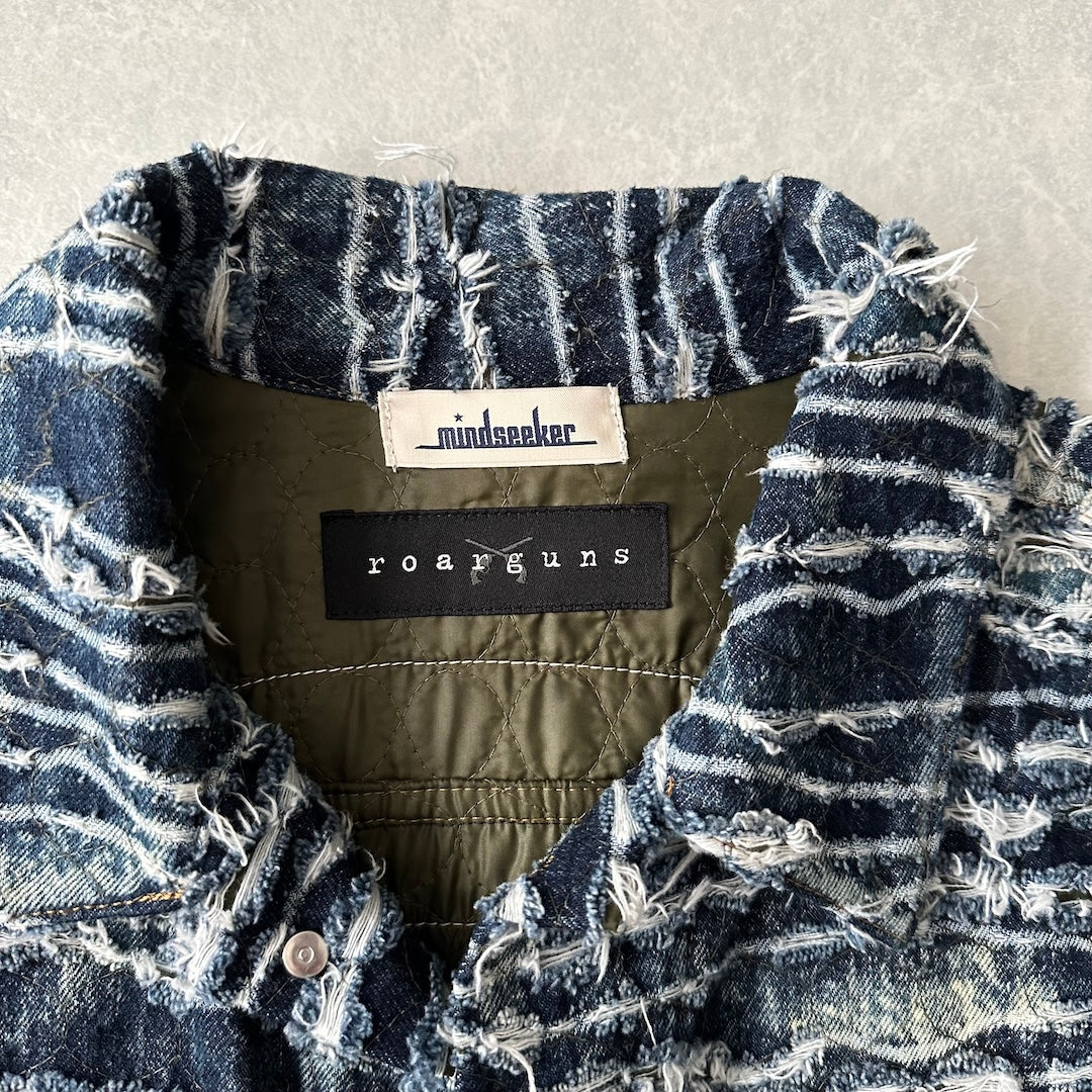 【mindseeker × roarguns】プリント キルティング デニム ジャケット ブルー L 古着 メンズ 古着男子 ブランド古着 パンク ロック 切りっぱなし ミリタリー