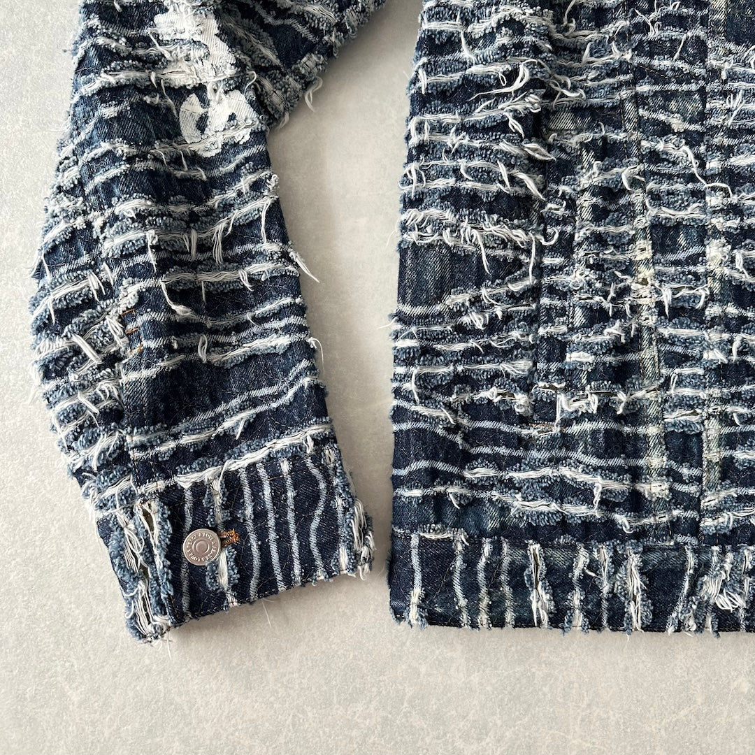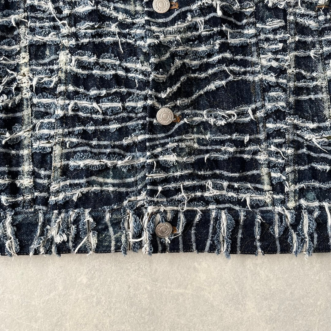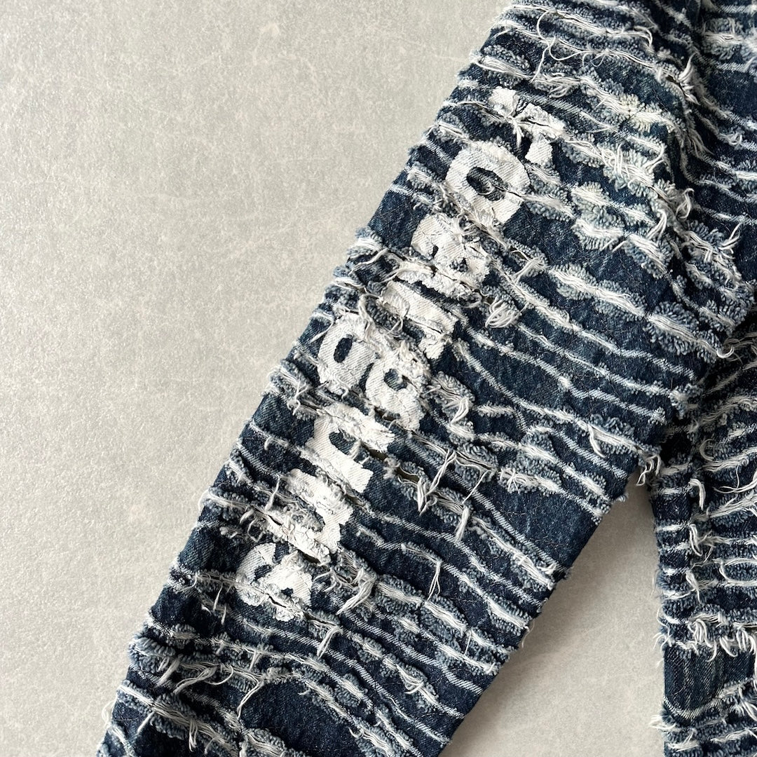 【mindseeker × roarguns】プリント キルティング デニム ジャケット ブルー L 古着 メンズ 古着男子 ブランド古着 パンク ロック 切りっぱなし ミリタリー