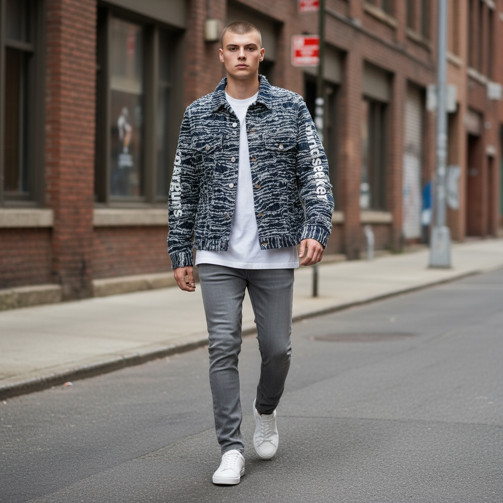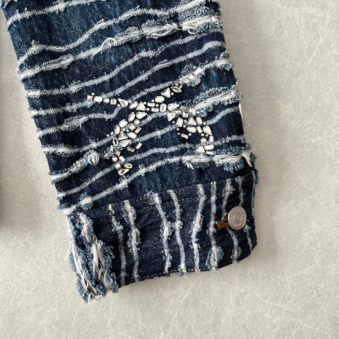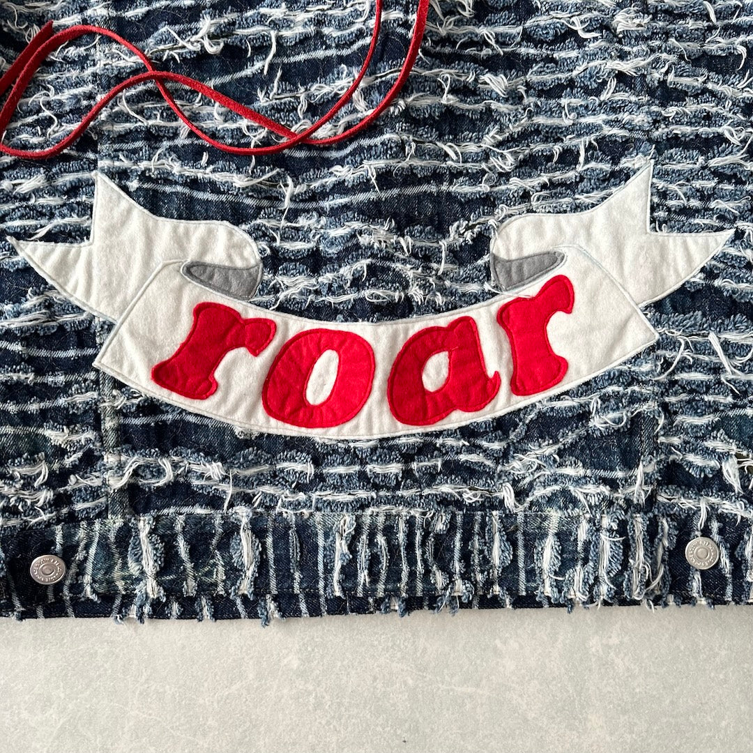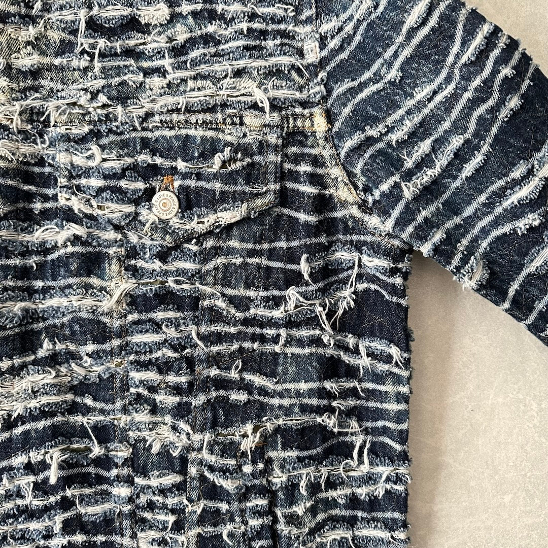 【mindseeker × roarguns】プリント キルティング デニム ジャケット ブルー L 古着 メンズ 古着男子 ブランド古着 パンク ロック 切りっぱなし ミリタリー