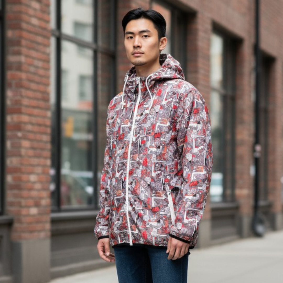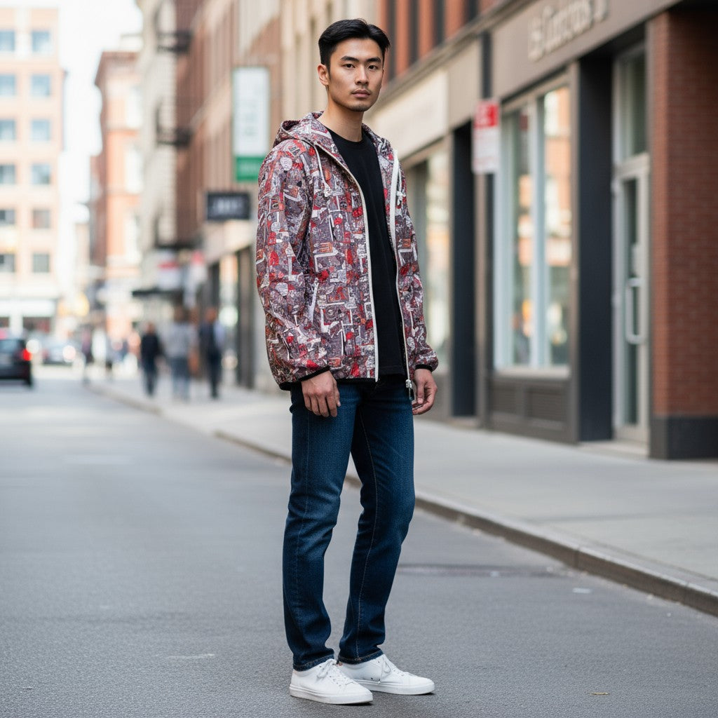 アニコミ柄 ポップ プリント ナイロン ダブルジップ パーカー 総柄 XL 古着 メンズ 古着男子 ストリート古着 アニメ コミック パッカブル仕様 収納バッグ