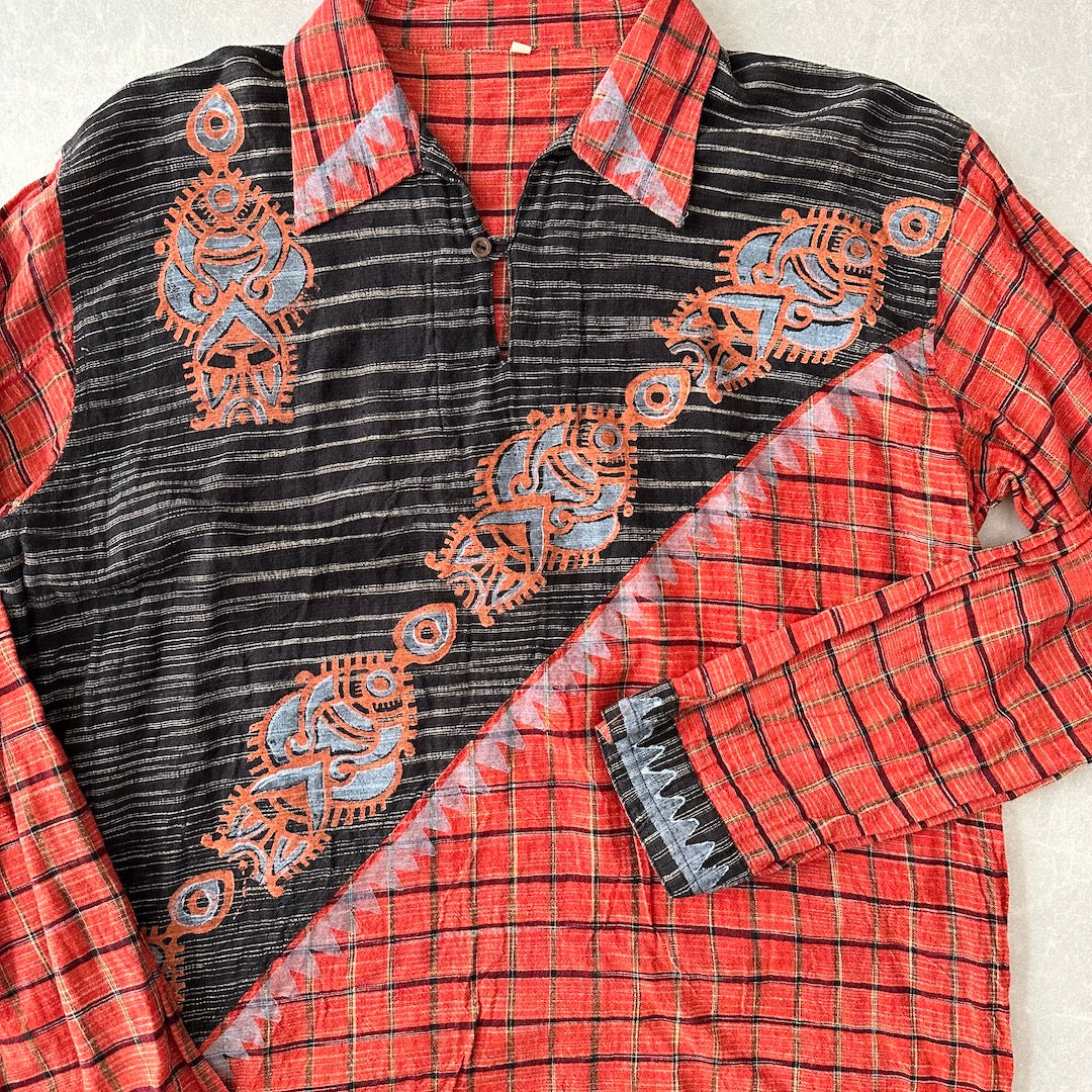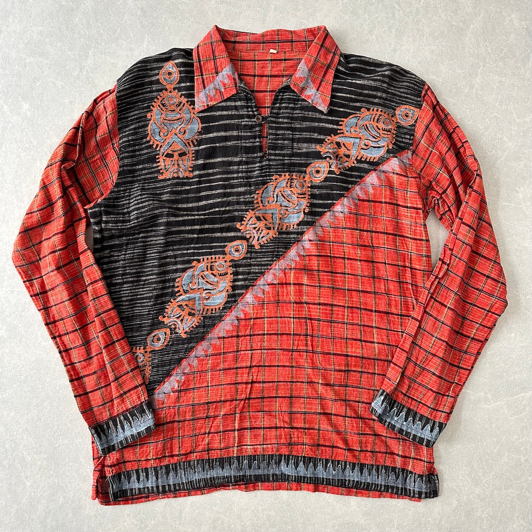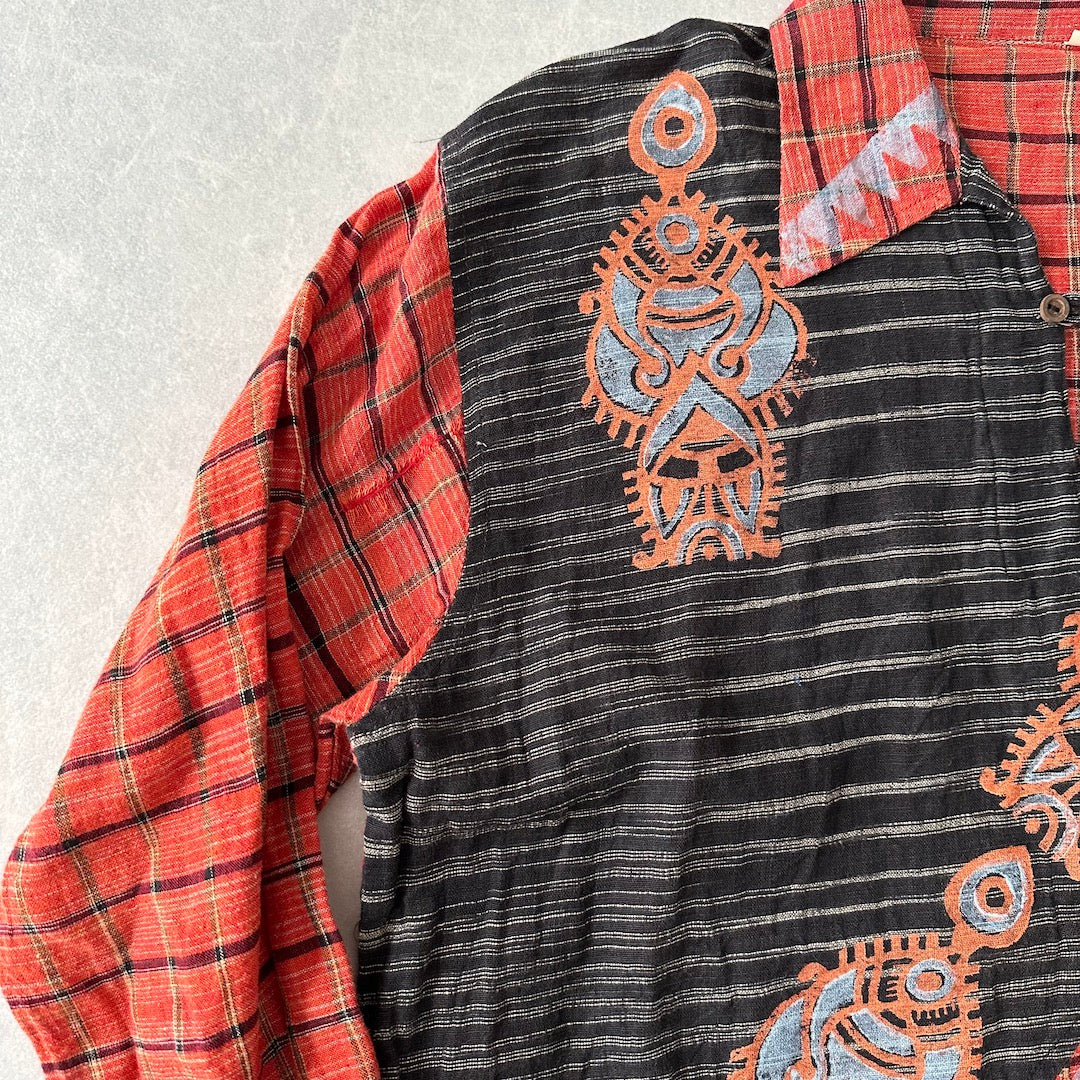 ネイティブ柄 シャツ 総柄 M 古着 メンズ 古着男子 チェック インド 幾何学柄 オレンジ ブラック 黒