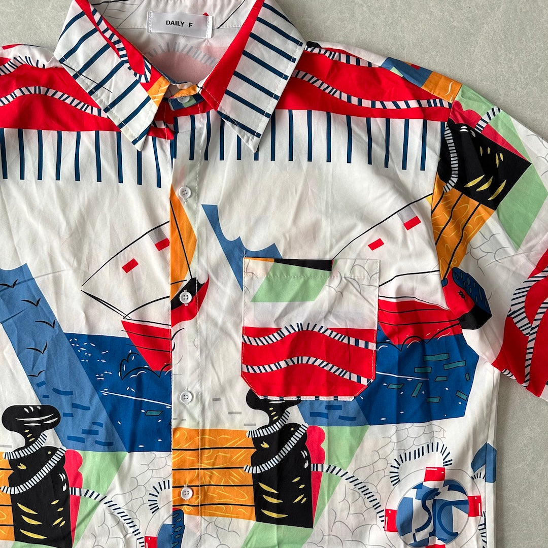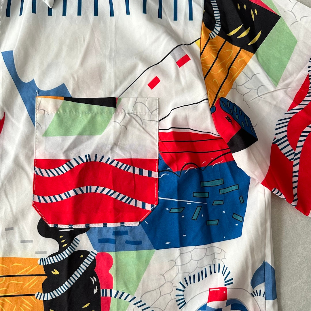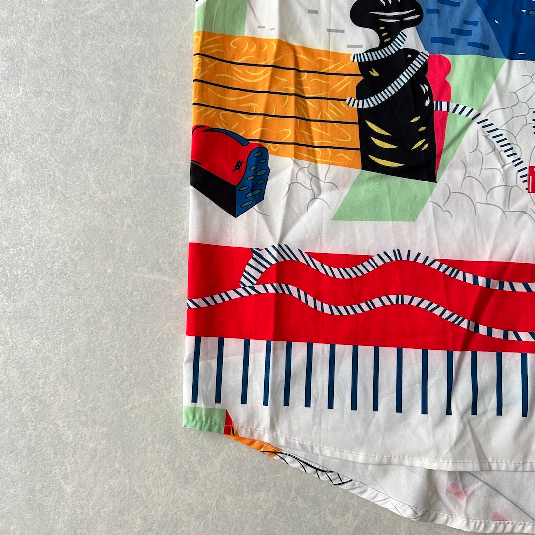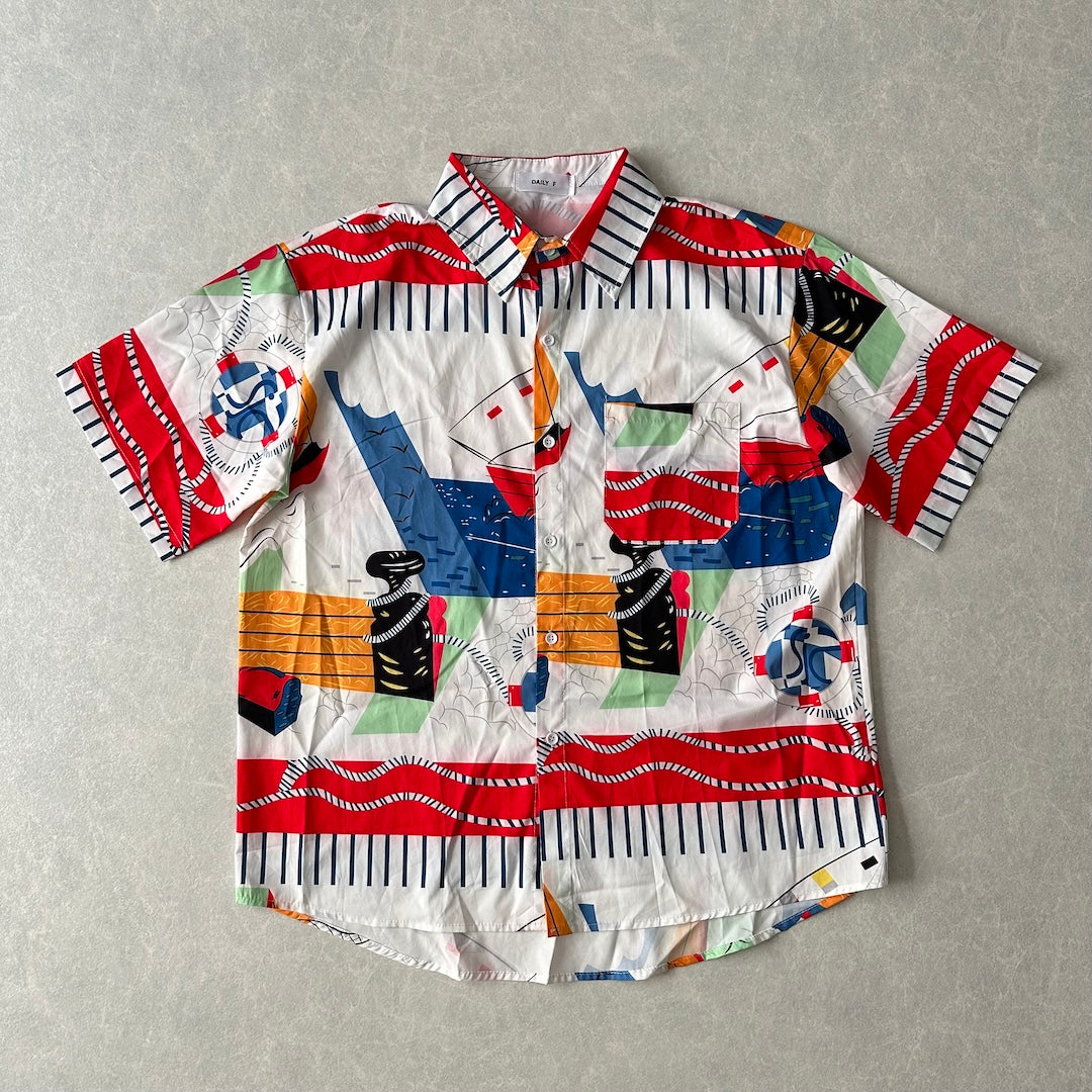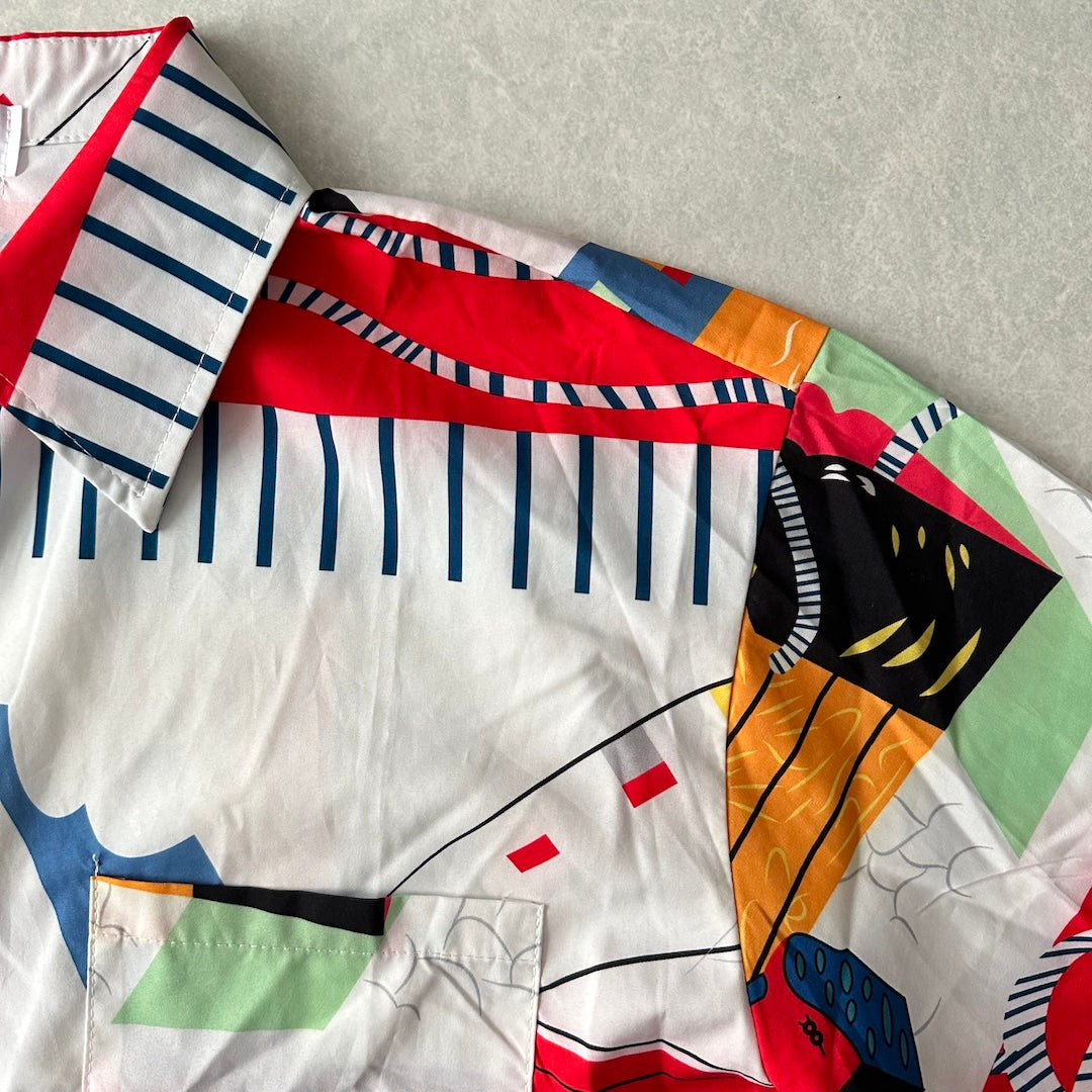 アート柄 半袖シャツ 総柄 L 古着 メンズ 古着男子 プリント ホワイト 白 レッド ブルー イエロー 赤 青 黄色