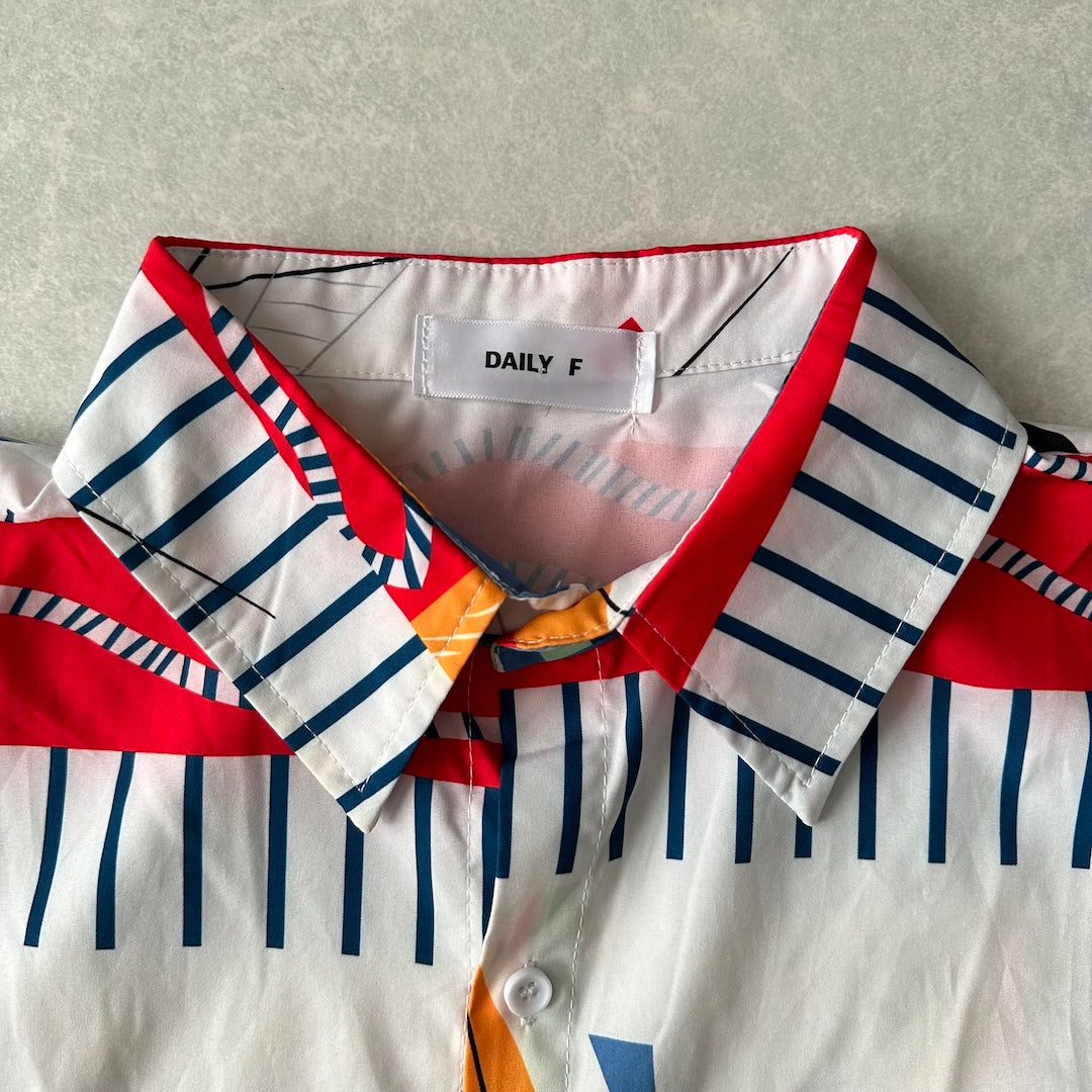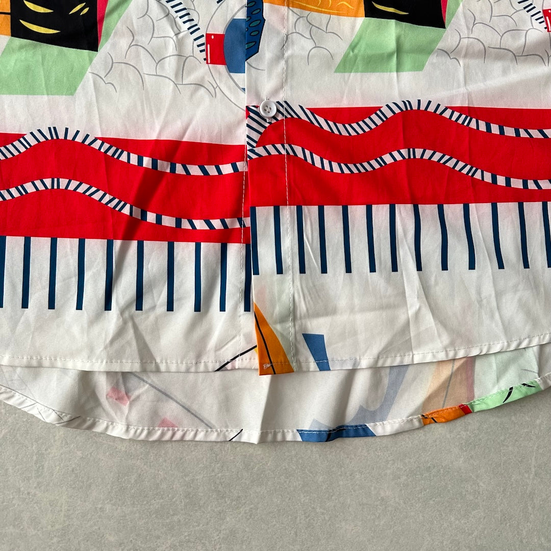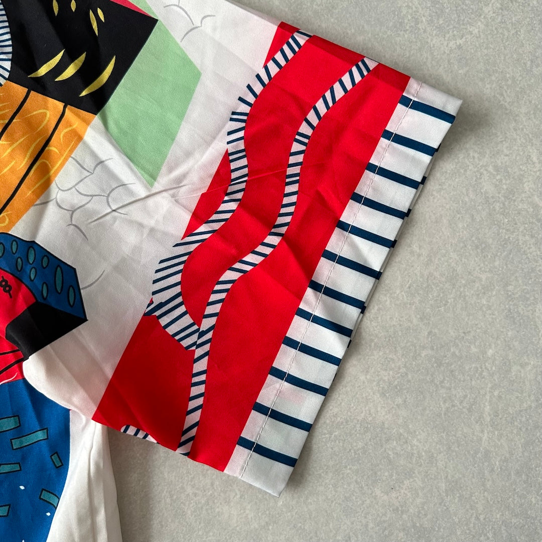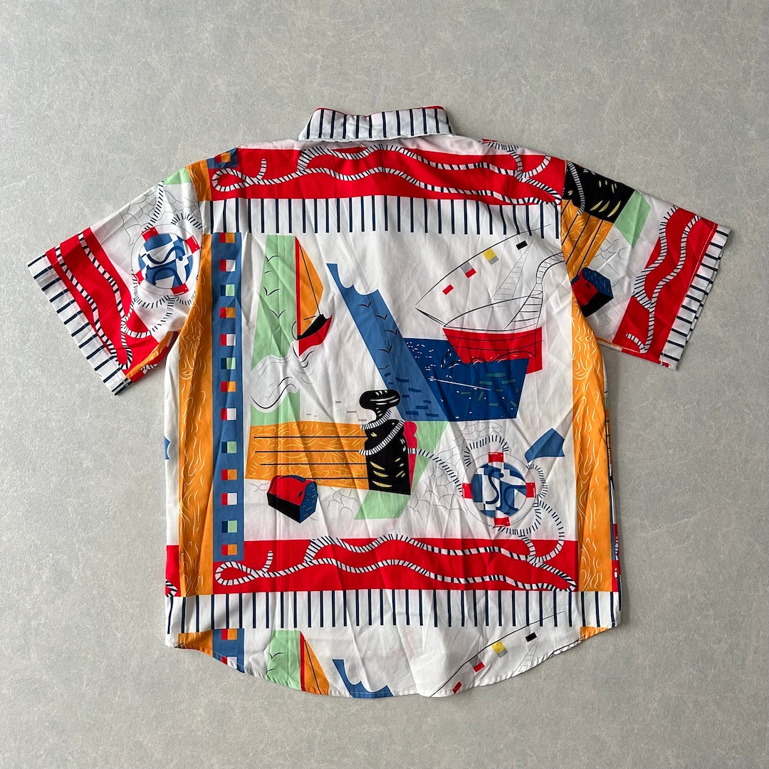 アート柄 半袖シャツ 総柄 L 古着 メンズ 古着男子 プリント ホワイト 白 レッド ブルー イエロー 赤 青 黄色