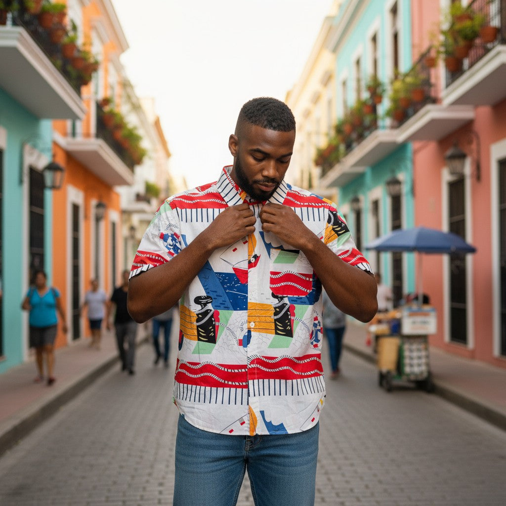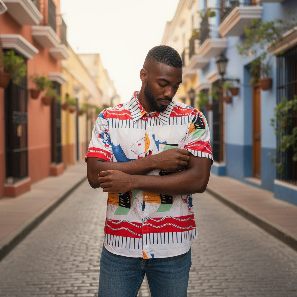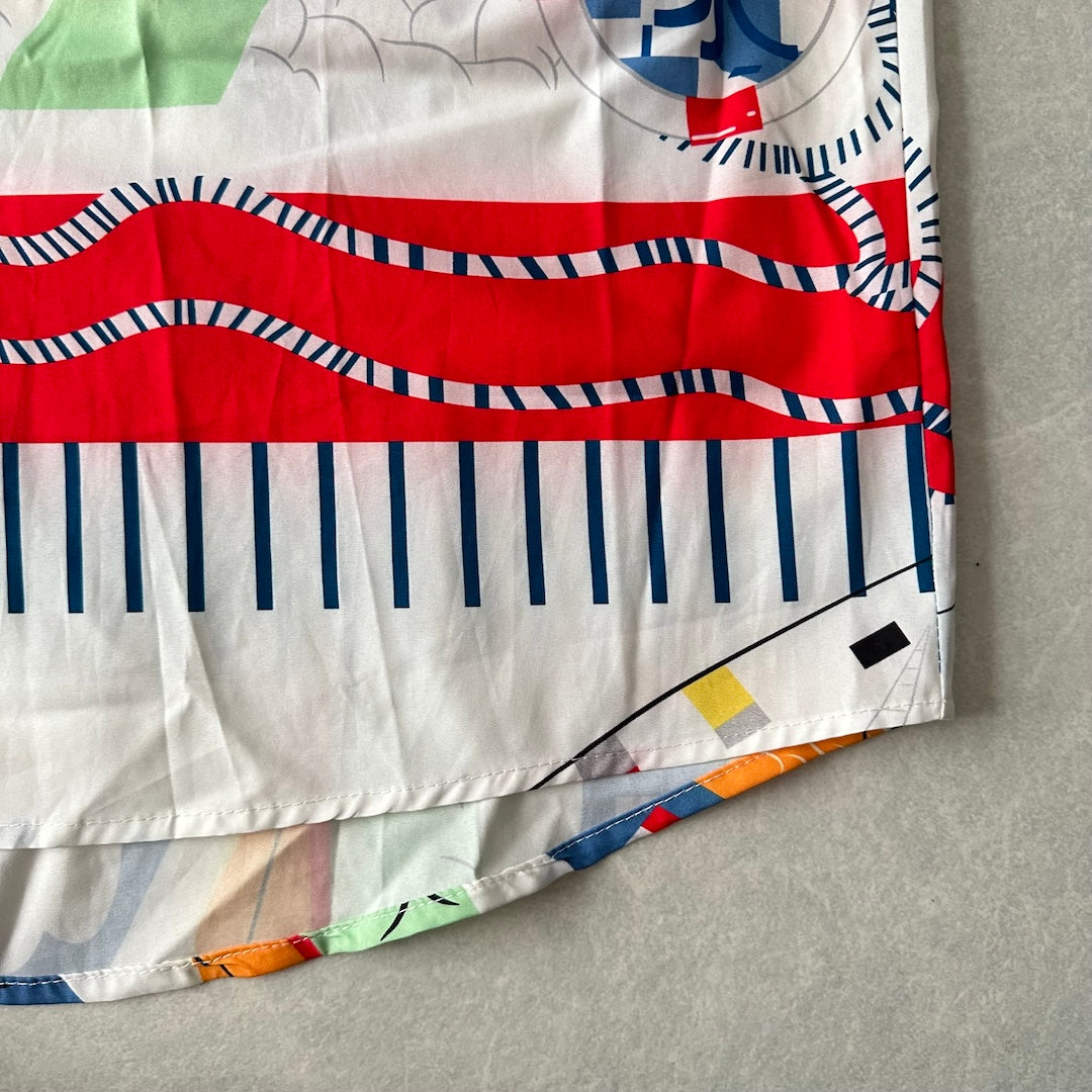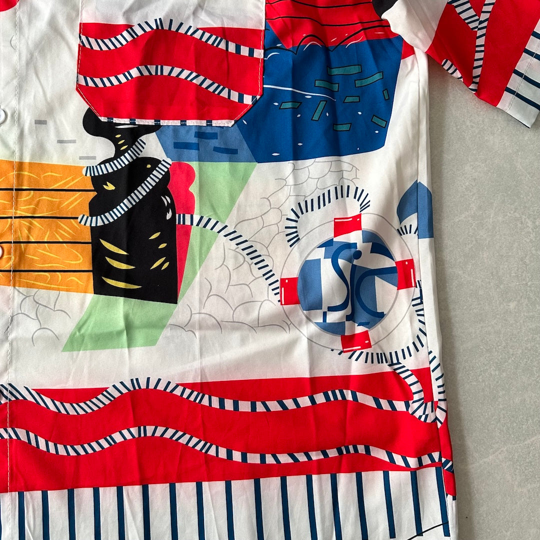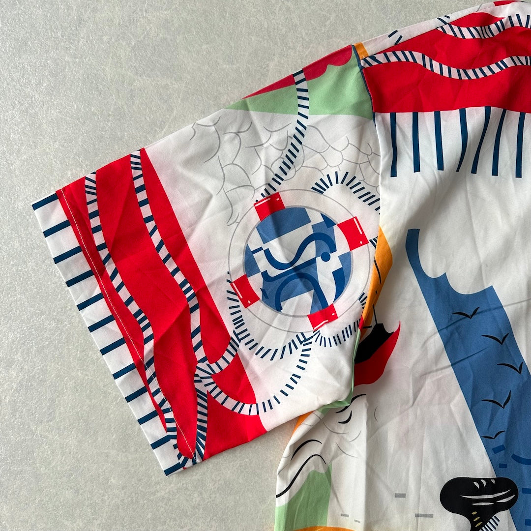 アート柄 半袖シャツ 総柄 L 古着 メンズ 古着男子 プリント ホワイト 白 レッド ブルー イエロー 赤 青 黄色