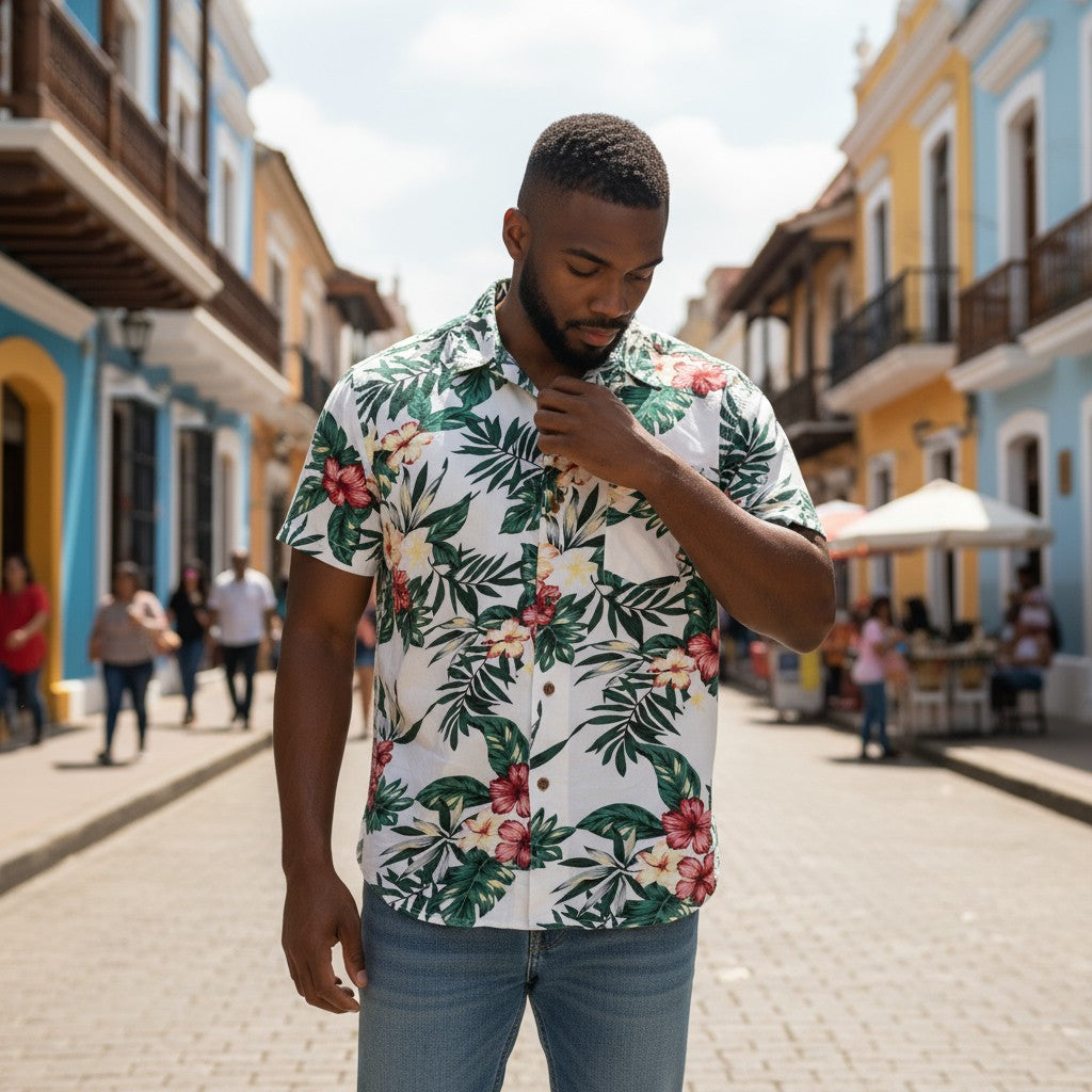 ボタニカル柄 リーフ プリント 半袖 シャツ 総柄 L 古着 メンズ 古着男子 サーフ古着 海 ビーチ 南国 トロピカル リゾート ホワイト 白 グリーン 緑 花柄
