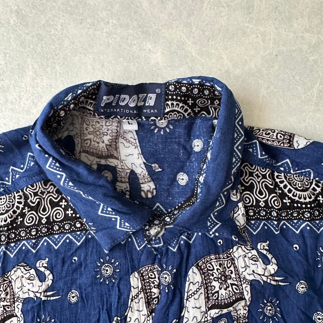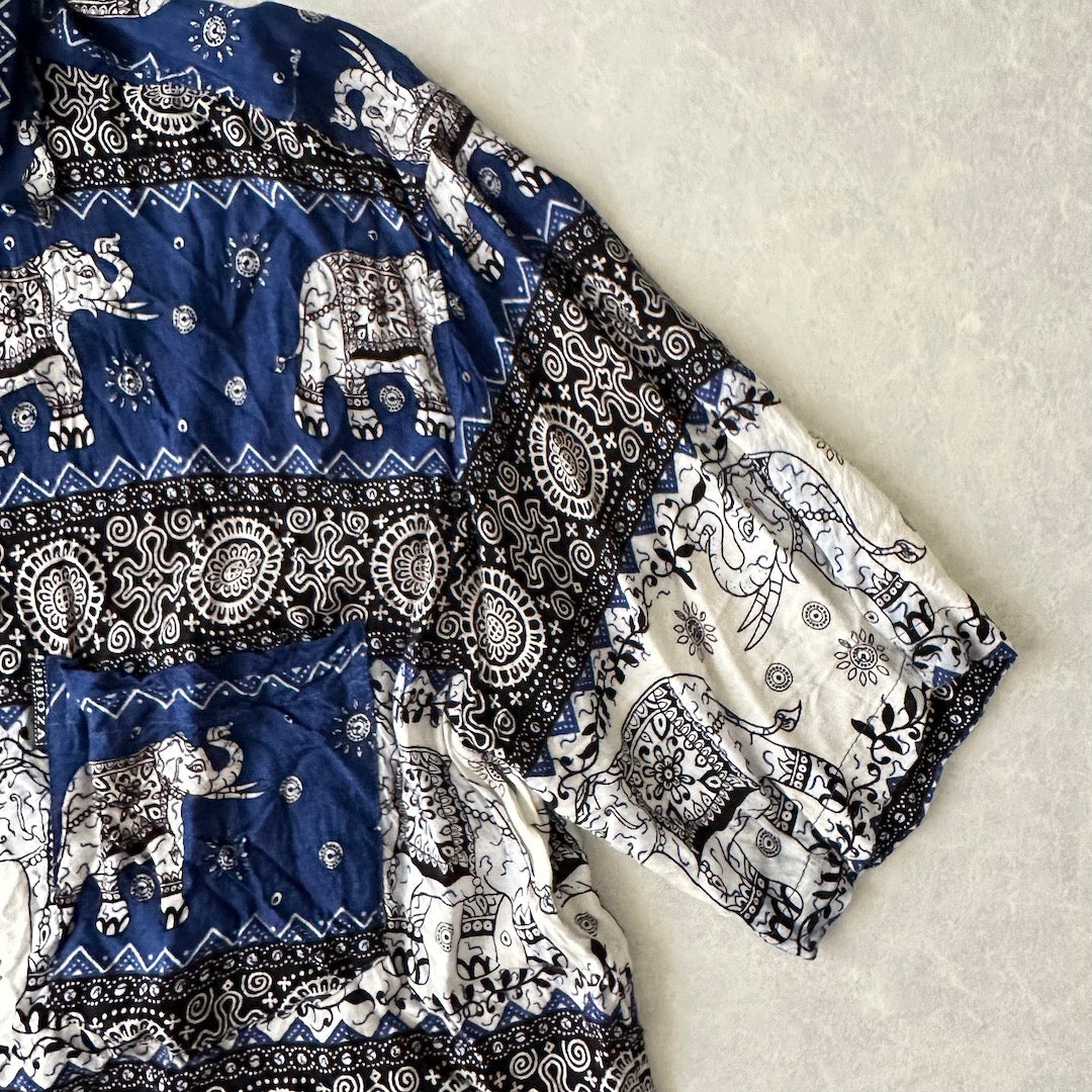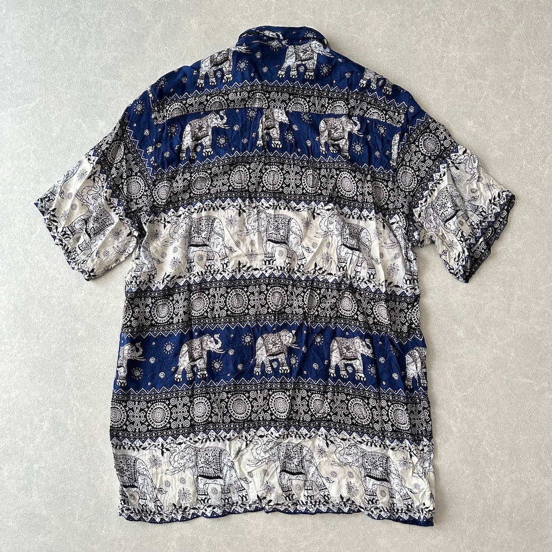 ゾウ柄 半袖シャツ 総柄 L 古着 メンズ 古着男子  サーフ古着 インド エスニック ブルー ホワイト 青 白