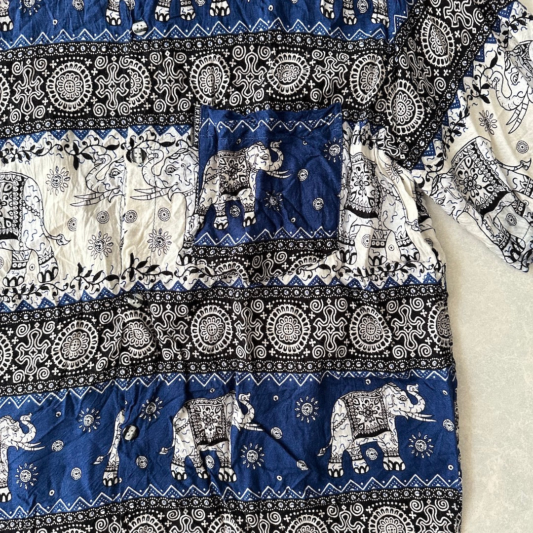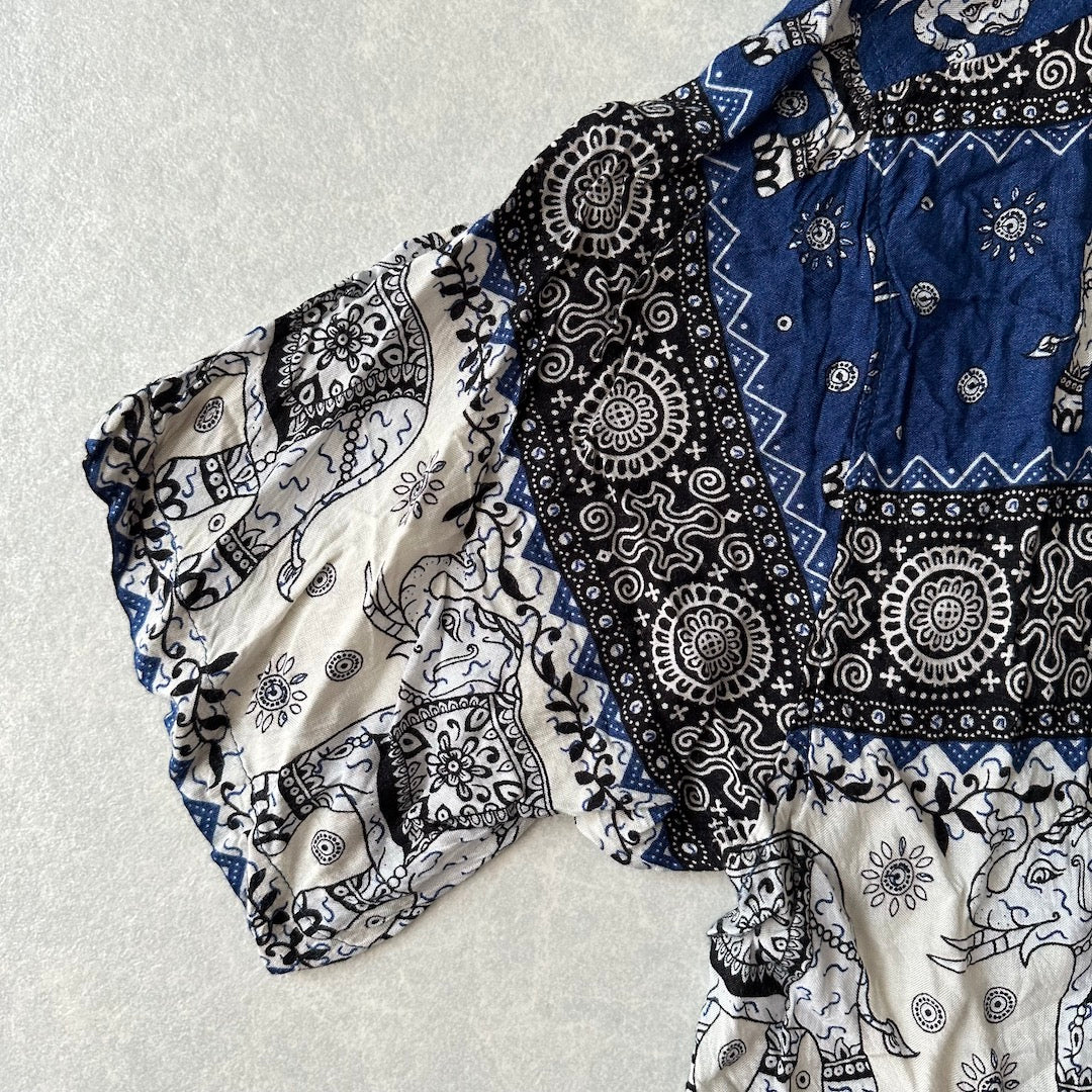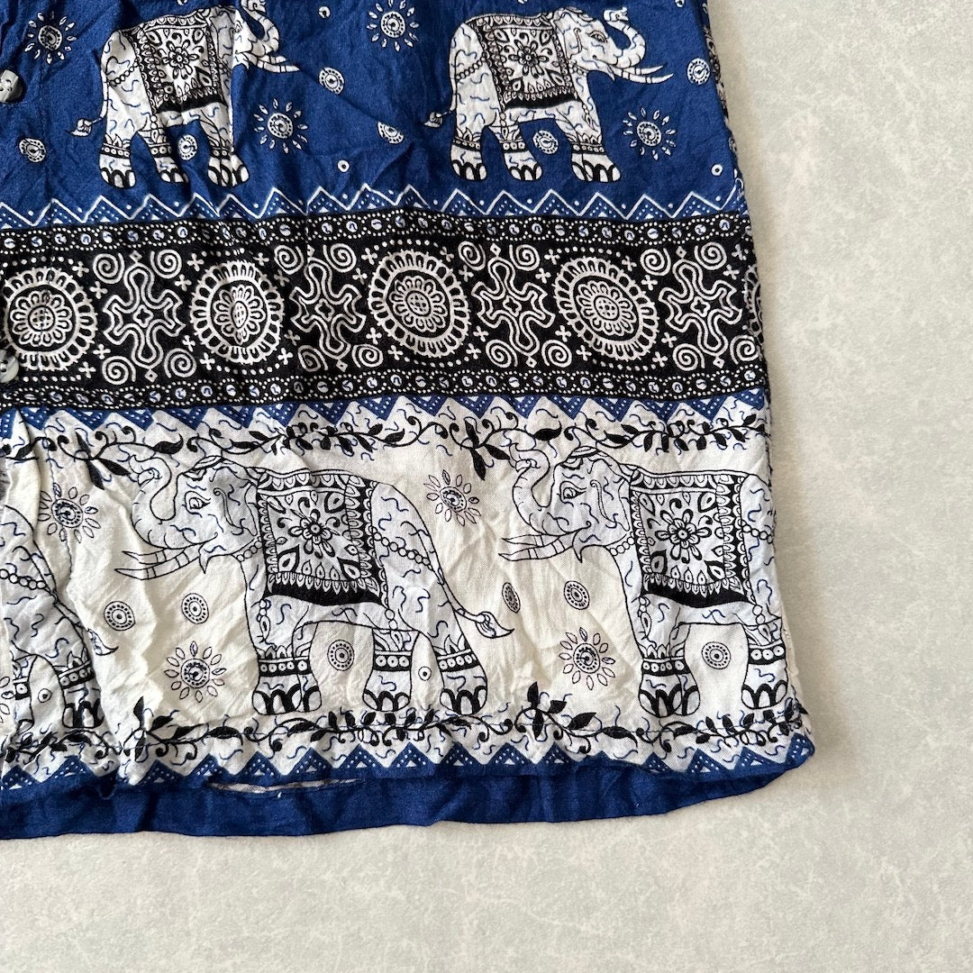 ゾウ柄 半袖シャツ 総柄 L 古着 メンズ 古着男子  サーフ古着 インド エスニック ブルー ホワイト 青 白